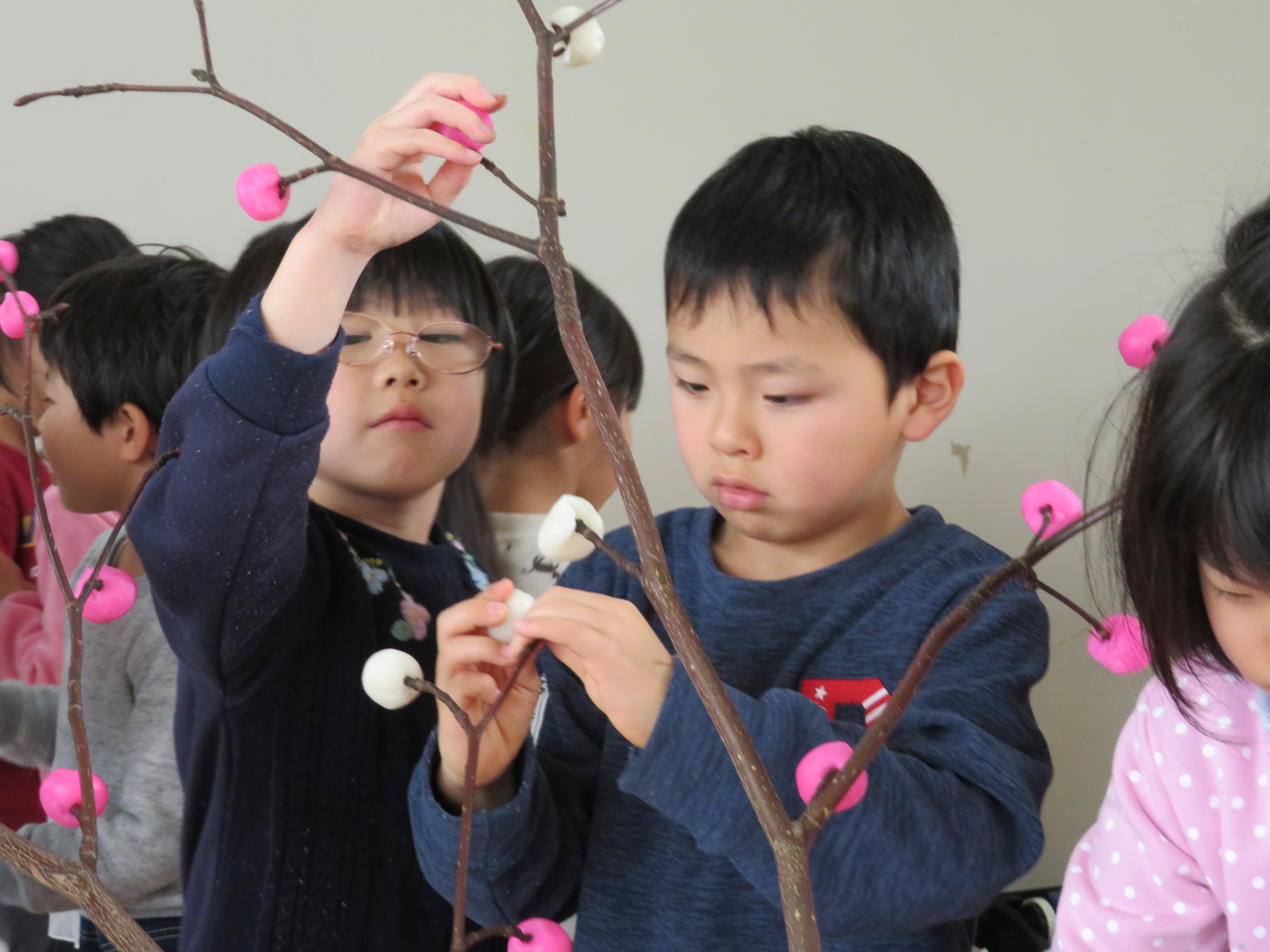だんごさしin保原幼稚園 2020/01/17 2020.1.17 1月14日(火)、保原幼稚園の年長組さんで、だんごさしの行事を行いました。 はじめに、歴史研究家の遠藤利夫先生よりだんごさしの由来のお話を聞き、 3本のみずきの樹に紅白のだんご、鯛や小判のせんべいをつけていきました。 はじめての体験でしたが、楽しく日本の伝統文化に触れて、 さみしかった樹は、花が咲いた様にきれいに変身しました。
