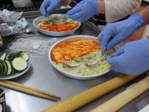 コロナ感染予防のため、アルコール消毒、マスク・手袋の着用で調理を始めました。