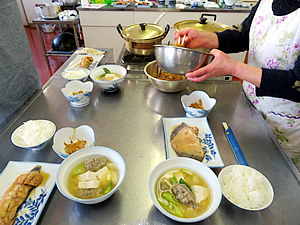 杉本洋子先生を講師に、「カレイの煮付け」「イカの塩辛」「いわしのつみれ汁」の三品を作りました。