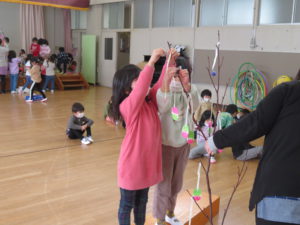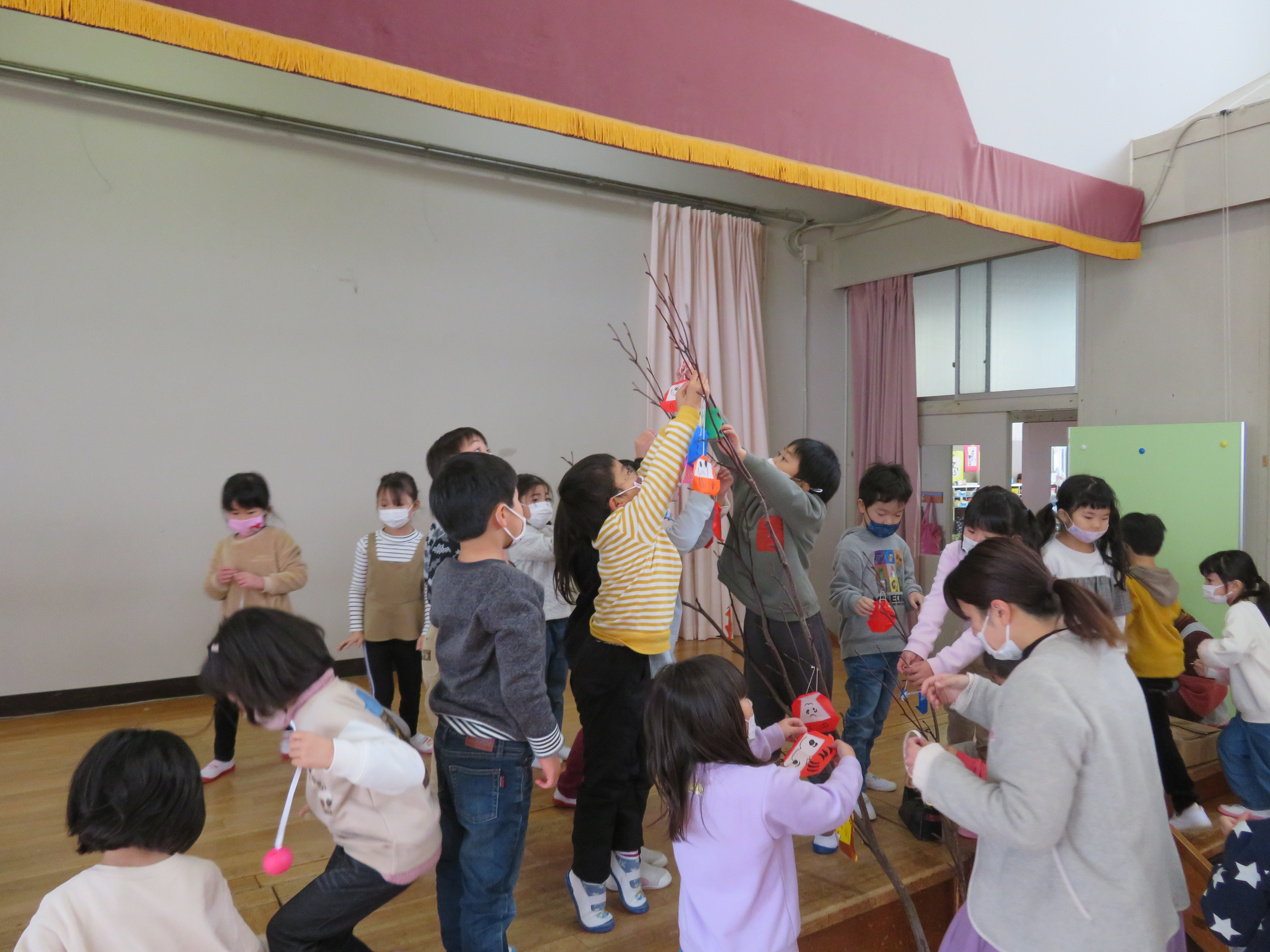 だんごさし 2022/01/25 1月14日、保原幼稚園において小正月の年中行事「だんごさし」を行いました。 「だんごさし」の由来について歴史研究家の遠藤利夫先生に講話をいただき、 子供たちは折り紙で作った飾りや紅白の団子、鯛や小判をミズキの木に飾りました。
