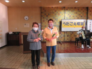 11月のうたごえ喫茶 2022/12/05 11月のうたごえ喫茶を開催しました。 今月は、皆既月食にちなんで月の歌と参加の皆さんからのリクエストを千本松さんのアコーディオンの伴奏で楽しく歌い、休憩後には11月、12月のお誕生会も行いました。 *コロナ感染対策を行いながら実施しました。